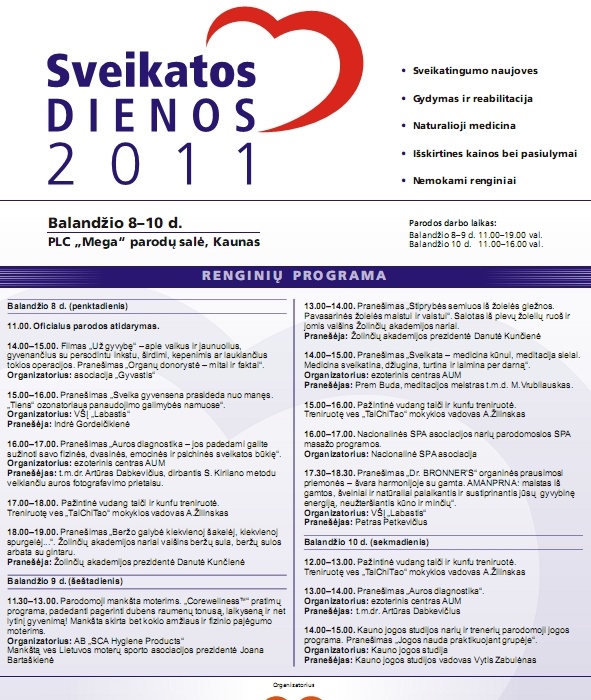 Medicinos ir sveikatingumo paroda “Sveikatos dienos 2011” bus atidaryta 11.00 val. Tris dienas truksiančioje parodoje išgirsite ne tik specialistų skaitomus pranešimus, tačiau ir patys galėsite sudalyvauti pažintinėse wudang taiči ir kunfu treniruotėse, parodomojoje SPA masažo ir jogos treniruotės programose.
