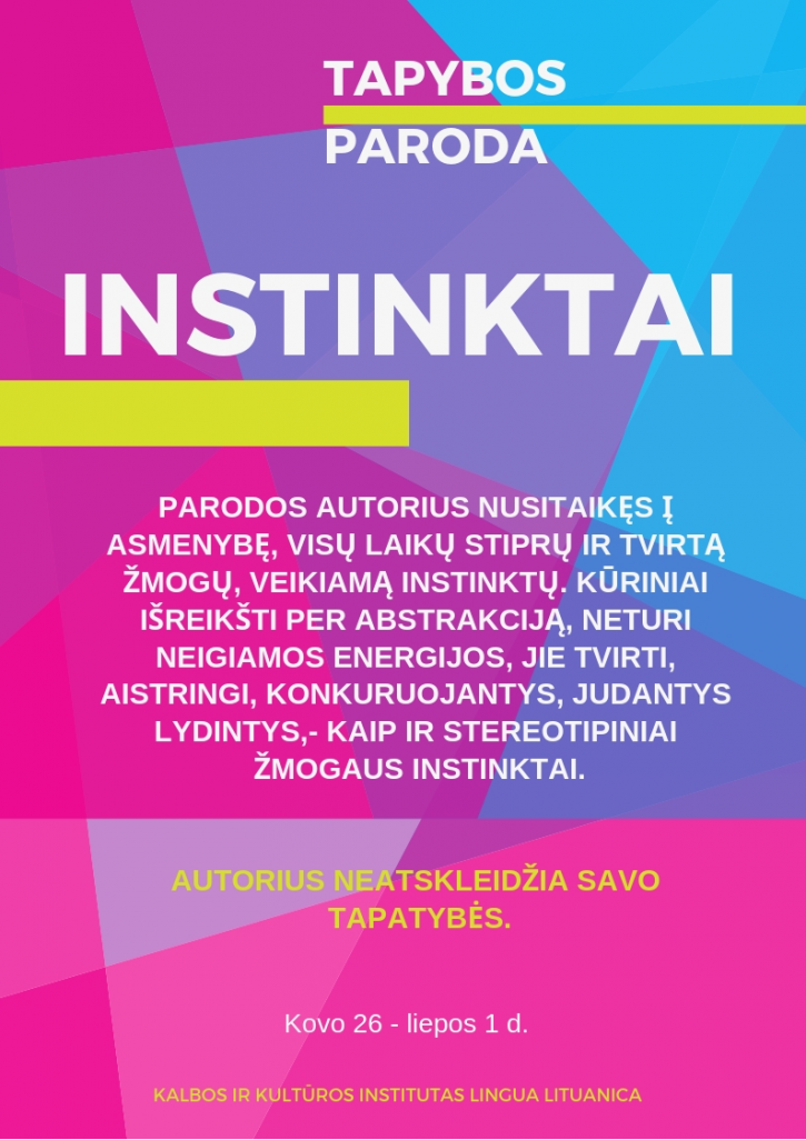 Kovo 26 – liepos 1 d. Kalbos ir kultūros institute LINGUA LITUANICA veikia paslaptinga tapybos paroda „Instinktai“. Autorius neatskleidžia savo tapatybės, nes mano, kad autoriaus vardas gali daryti įtaką vertinant kūrinį. „Man svarbu, kad žmogus pirma pajaustų patį paveikslą, kad paveikslas užvaldytų jo vaizduotę, o tada galima pažintis ir su autoriumi.“