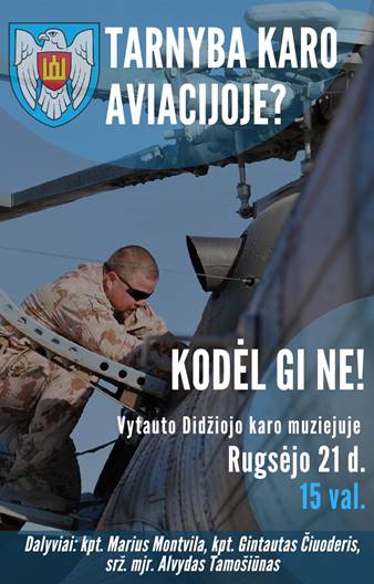Vytauto Didžiojo karo muziejus tęsia susitikimų ciklą „Susipažinkite – karinės specialybės“! Šį kartą kviečiame iš arčiau pažvelgti į Karinių oro pajėgų karių kasdienybę. Išgirsite pasakojimus apie tarnybą karo aviacijoje, sužinosite įdomiausias detales apie tarnybą tarptautinėje operacijoje Kandahare, Pietų Afganistane. Renginio svečiai taip pat papasakos koks buvo Lietuvos karių sąlytis su talibais, 50°C karščiu, apie išgyventas smėlio audras ir neregėtą ledų krušą bei ką reiškia afgano pasiūlytas arbatos puodelių skaičius. Kariai patvirtins koks svarbus komandinis darbas ir tam tikrų įgūdžių žinojimas, kurie reikalingi gelbstint kolegų gyvybę. Išgirdę pasakojimus galėsite apžiūrėti Lietuvos karo aviacijos uniformą (1931 –1940) ir dabartinių Lietuvos bei Danijos karinių oro pajėgų uniformų pavyzdžius.