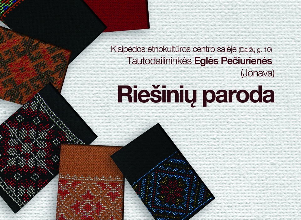 Lapkričio 16 d. 16.00 val. Klaipėdos etnokultūros centre (Daržų g. 10) atidaroma tautodailininkės Eglės Pečiurienės (Jonava) sukurtų riešinių paroda. Paroda veiks iki gruodžio 21 d.