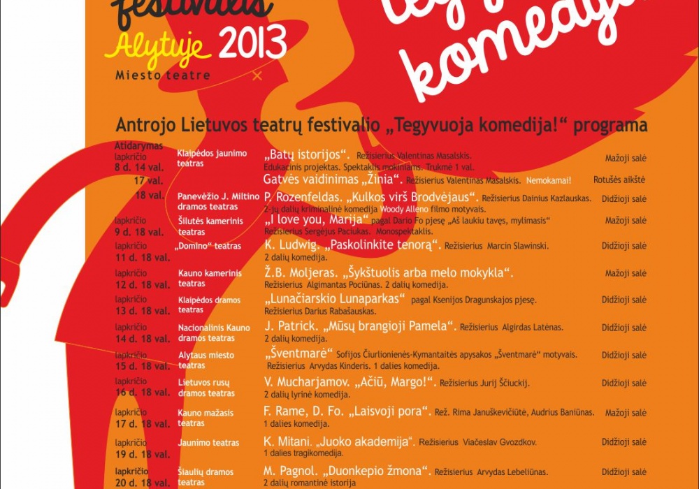 Alytaus miesto teatras skelbia 2-ąjį festivalį TEGYVUOJA KOMEDIJA!’13. Iki pasimatymo.Plačiau apie festivalio programą: http://www.teatrufestivalis.lt/