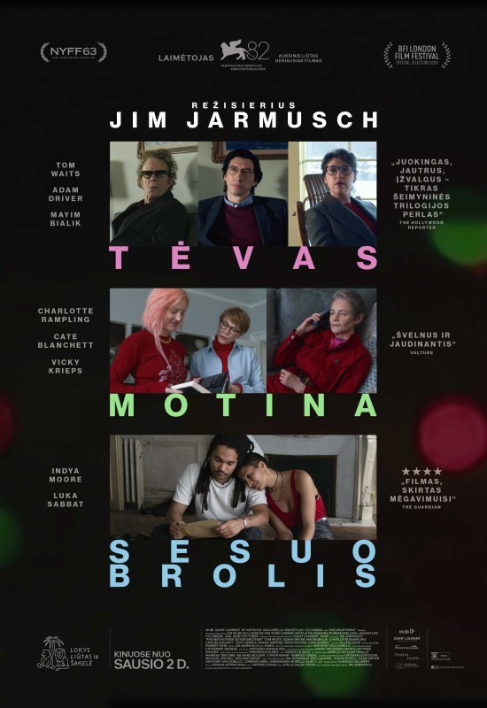 JAV kino režisierius Jim Jarmusch jau keturis dešimtmečius išlieka autoriumi, kurio savito stiliaus, ironiško ir išmintingo žvilgsnio į pasaulį ir žmones sujokiu kitu kino kūrėju nesupainiosi. Kiekvienas naujas filmas jo gerbėjams – dovana, o jauniems kino mėgėjams – išskirtinio autorinio kino atradimas. „TĖVAS MOTINA SESUO BROLIS“ tarptautiniame Venecijos festivalyje 2025 m. buvo apdovanotas pagrindiniu prizu „Aukso liūtas“.