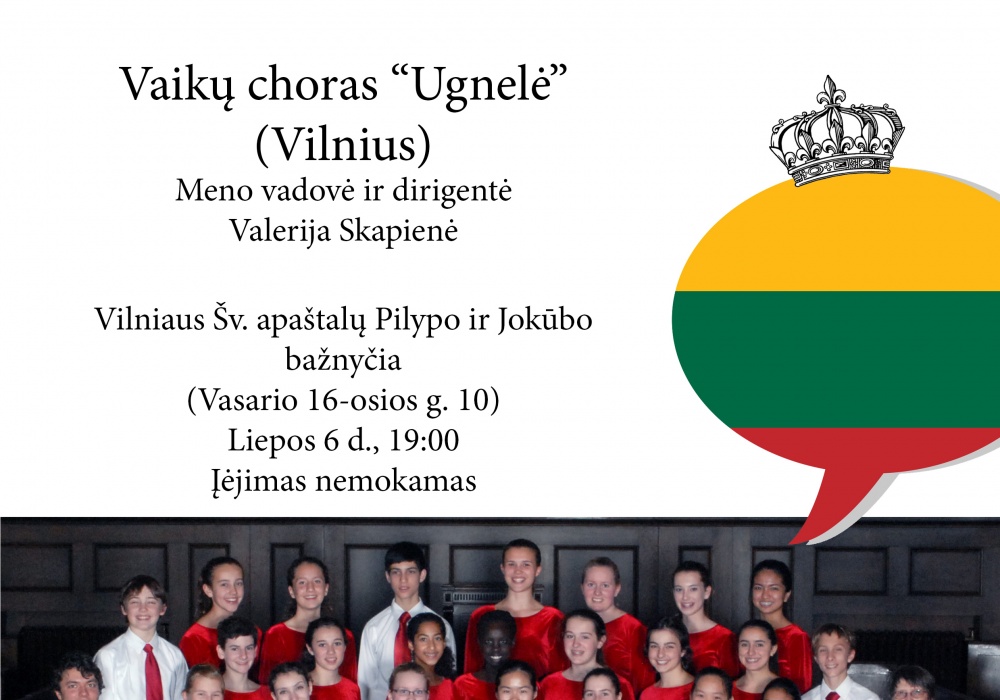 Svečius iš Toronto Lietuvoje sveikins ir koncertą atidarys vaikų choras “Ugnelė” – savo istoriją nuo 1954-ųjų skaičiuojantis kolektyvas, išsivystęs iš dainų ir šokių ansamblio „Ugnelė“. Choras Lietuvos kultūrą yra pristatęs penkiolikoje užsienio šalių nuo Nyderlandų iki Pietų Korėjos; 2004 m. kolektyvas pradėjo rengti respublikinį moksleivių chorų festivalį „Dainų mozaika“, kurio metu 2015 m. pasiekė ilgiausio Lietuvos istorijoje moksleivių chorų koncerto rekordą. 2010 m. choras „Ugnelė“ buvo pakviestas tapti Vilniaus J. Tallat-Kelpšos konservatorijos dalimi, kur kaip savarankiškas kolektyvas dirba iki šiol.