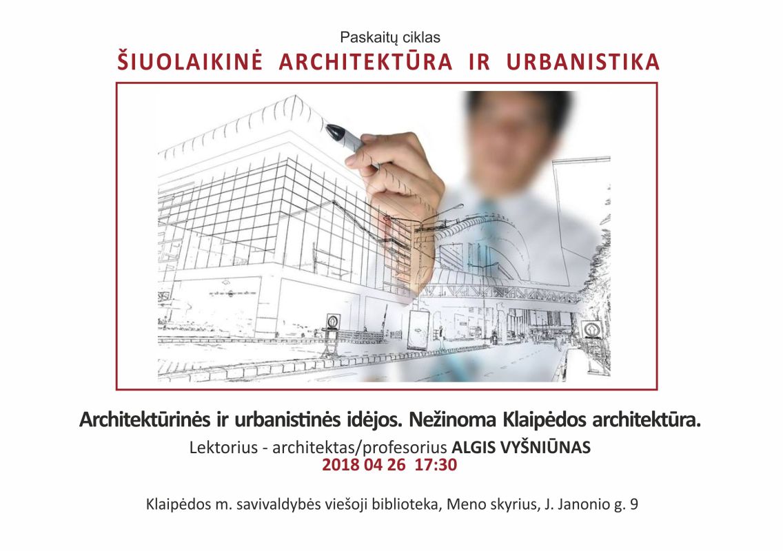 Klaipėdos miesto savivaldybės viešosios bibliotekos Meno skyriuje (J. Janonio g. 9) tęsiamas architekto-profesoriaus Algio Vyšniūno paskaitų ciklas „Šiuolaikinė architektūra ir urbanistika“.