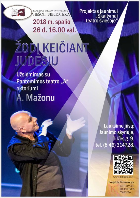 Spalio 26 d. 16.00 val. Klaipėdos miesto savivaldybės viešosios bibliotekos Jaunimo skyriuje (Tilžės g. 9) toliau tęsia projektą „Skaitymai teatro šviesoje“ ir kviečiame į užsiėmimą „Žodį keičiant judesiu“ kartu su Pantomimos teatro „A“ aktoriumi A. Mažonu.