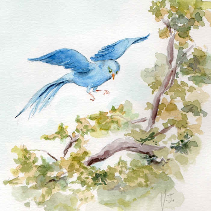 Sykį, ji pamatė gražią žydrą paukštytę, kuri skraidė aplink ją ir šokinėjo nuo šakutės ant šakutės. Paukštytė buvo visai nebaikšti, leidosi artyn prieiti, atrodė lyg prijaukinta. Ji pasirodydavo kiekvieną kartą, kai tik moteris eidavo per mišką. Pagaliau ji ėmė apie paukštytę šnekėti savo vaikams… “.