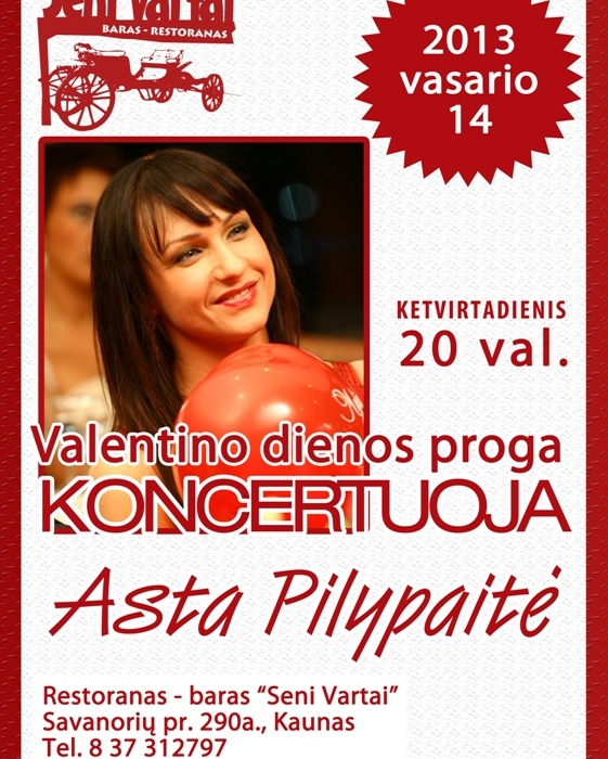 Visus mylimus ir mylinčius nuoširdžiai kviečiame sutikti meilės dieną restorane „Seni vartai“, nes čia Jums koncertuos žavioji ASTA PILYPAITĖ!!