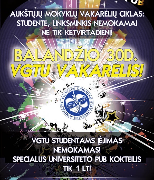 Jau Balandžio 30d. VGTU vakarėlis! Taigi, VGTU studente, nepražiopsok! Šis šeštadienis bus skirtas būtent tau ir visam tavo universitetui! VGTU studentams įėjimas NEMOKAMAS, o specialus Universiteto Pub`o kokteiltis tik 1LT! Mes siūlome puikiai subalansuotą studentišką vakarą – trūksta tik tavęs!