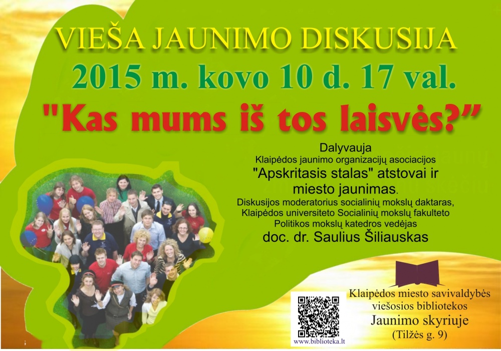Vieša jaunimo diskusija „Kas mums iš tos laisvės?”. Dalyvauja Klaipėdos jaunimo organizacijų asociacijos „Apskritasis stalas” atstovai ir miesto jaunimas.