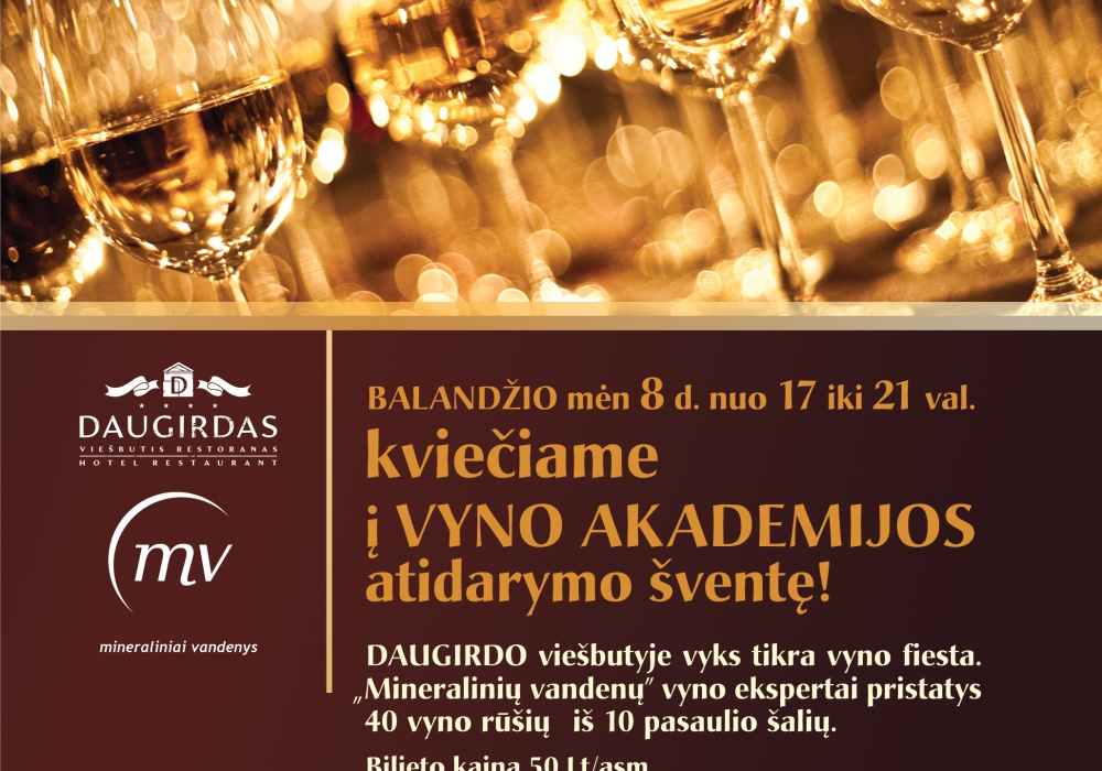UAB “Mineraliniai vandenys” ir viešbutis “Daugirdas” kviečia į VYNO AKADEMIJOS atidarymą! Vyno ekspertai pristatys 40 vyno rūšių iš 10 pasaulio šalių. Turėsite galimybę paragauti 20 pasirinktų vyno rūšių. Tegul vynas liejasi laisvai!