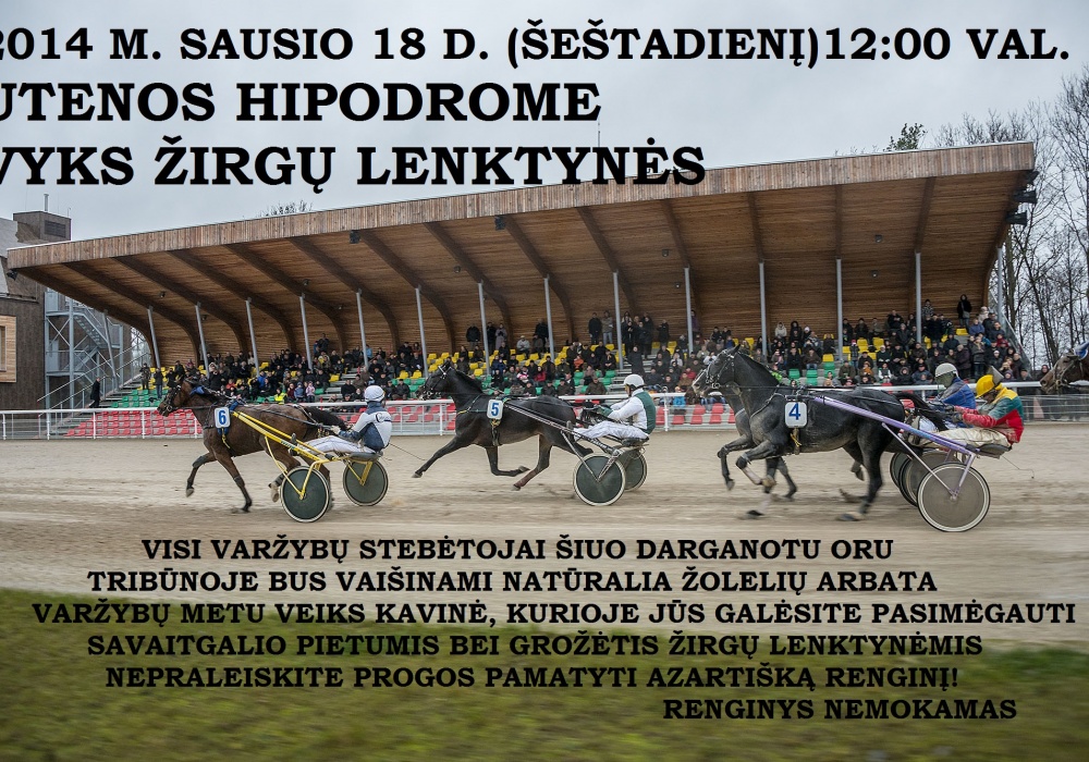 2014 m. sausio 18 d. (šeštadienį) 12:00 val. Utenos hipodrome vyks žirgų lenktynės. Visi varžybų stebėtojai bus vaišinami arbata. Varžybų metu veiks kavinė, kurioje galėsite pasimėgauti savaitgalio pietumis bei grožėtis žirgų lenktynėmis.