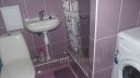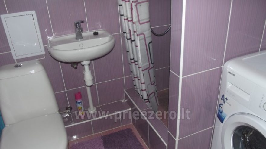 WC-vonios kambaryje yra dušo kabina, skalbimo mašina, plaukų džiovintuvas.