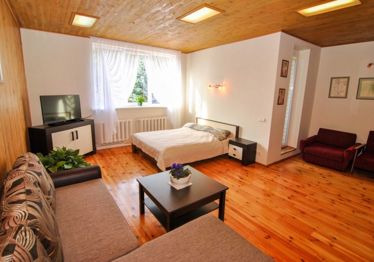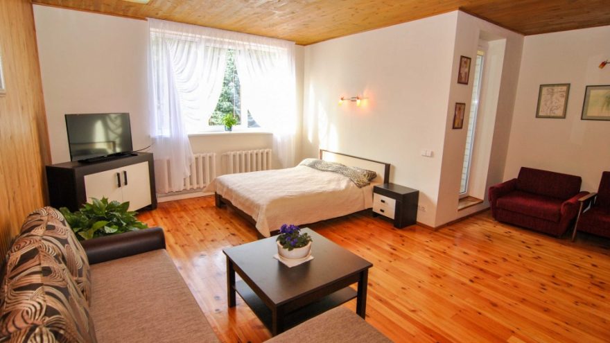 Poilsiui išnuomojamas erdvus 1 kambario butas po remonto, esantis ne prie gatvės, 4 butų kotedžų tipo name. Virtuvėje yra visa buitinė įranga, erdvus dušo kambarys, fenas, nemokamas WiFi, didelis TV, balkonas, atskira laiptinė, nemokama tik Jūsų automobiliui skirta vieta, kieme pavėsinė, kepsninė.Tinka ramiam ir romantiškam poilsiui dviese ir šeimai su vaikais. Esam draugiški gyvūnams. Kaina asmeniui parai 10-12 eur. (jeigu 1 asmuo arba nuomoja 1 parai – kaina sutartinė), vaikams taikome nuolaidas.