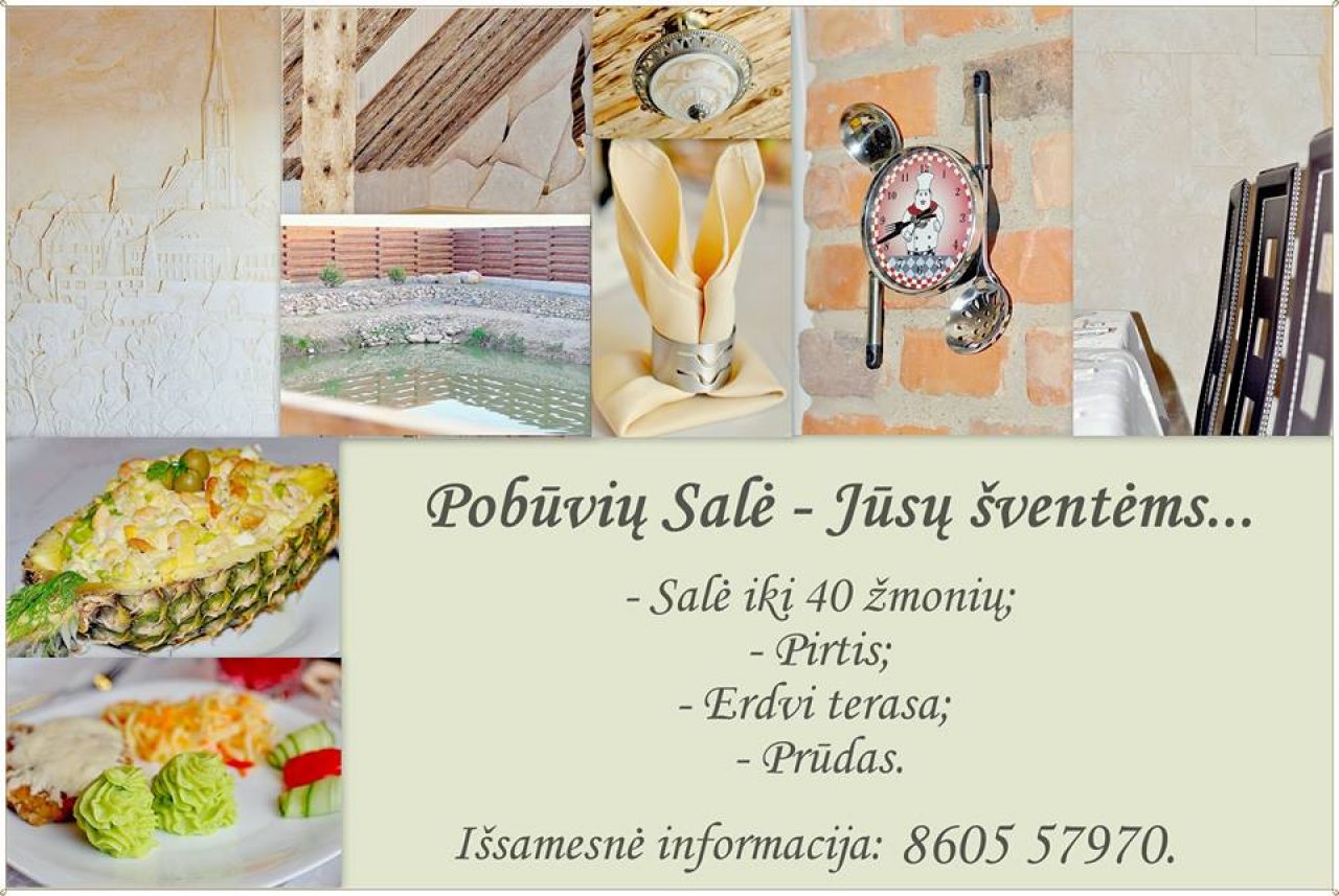 Salė pobūviams vos 4 km nuo Kretingos, talpinanti iki 30 žmonių, naminis skanus, pigus maistas, galima nuomotis salę ir atsivežant savo maistą, didžiulė terasa, yra pirtis, vandens tvenkinys, norinties suteikiama nakvynė, atskiras salytė prie pirties, talpinanti 12 žm.