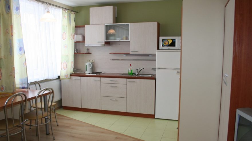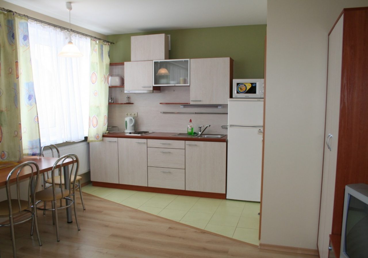 Puiki apartamentų įranga – nauji baldai, dvi miegamojo lovos, išlankstoma erdvi dvigulė sofa svetainėje. Svečių patogumui įrengta itin moderni virtuvė, su visa reikiama įranga (šaldytuvas, mikrobangų krosnelė, duonos skrudintuvė, vandens virdulys, kaitlentė), svetainėje yra televizorius.