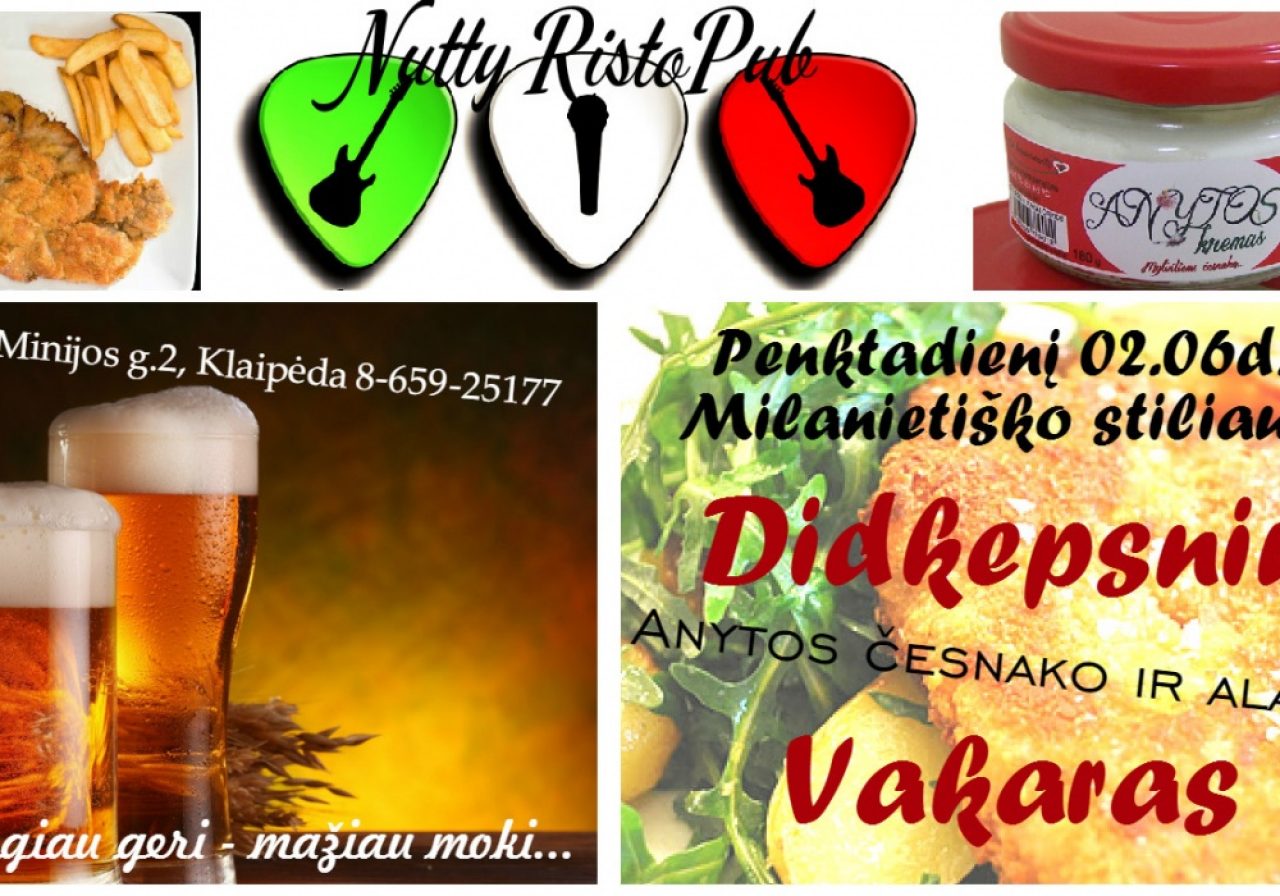Penktadienį kviečiame godžių skrandžių šeimininkus pavalgyti milanietiškų didkepsnių. Daug skambios itališkos muzikos, Nutty gamybos “Anytos” česnako, mėsos ir alučio, kuriam turėsime taip pat patrauklų pasiūlymą. Turėsime ir vegetarams “didkepsnio” pasiūlymą. Penktadieniui rezervacijos pageidaujamos tel: 8 659 25177