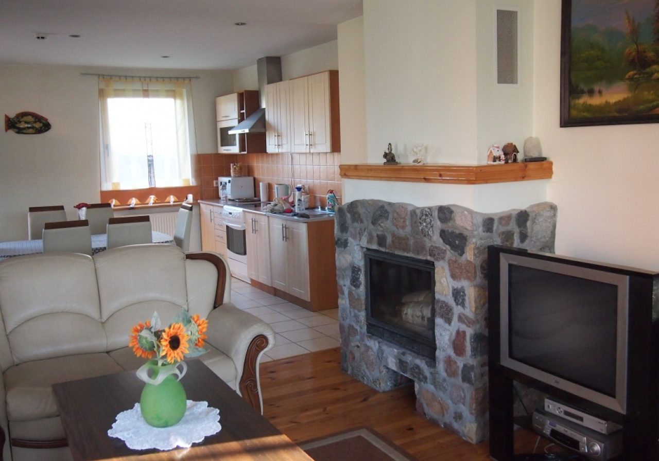 • Svetainė, sujungta su erdvia virtuve, kurioje yra visa reikiama buitinė technika (šaldytuvas, elektrinė viryklė, mikrobangė, elektrinis virdulys, blenderis), maisto ruošimo indai, įrankiai, stalo indai ir įrankiai.