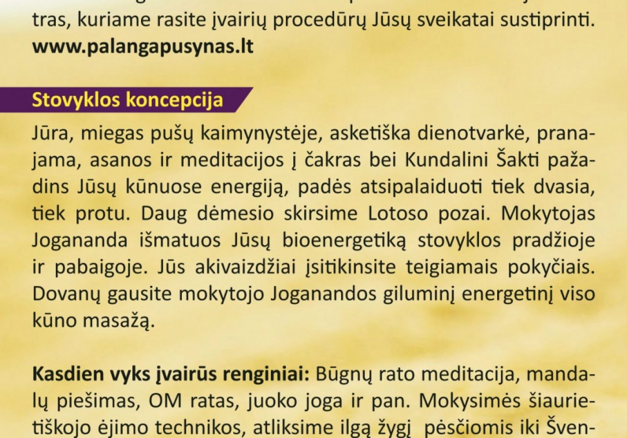 Jogos stovyklos, jogos užsiėmimai, masažai, šiaurietiškas ėjimas. Vasaros sezono metu.