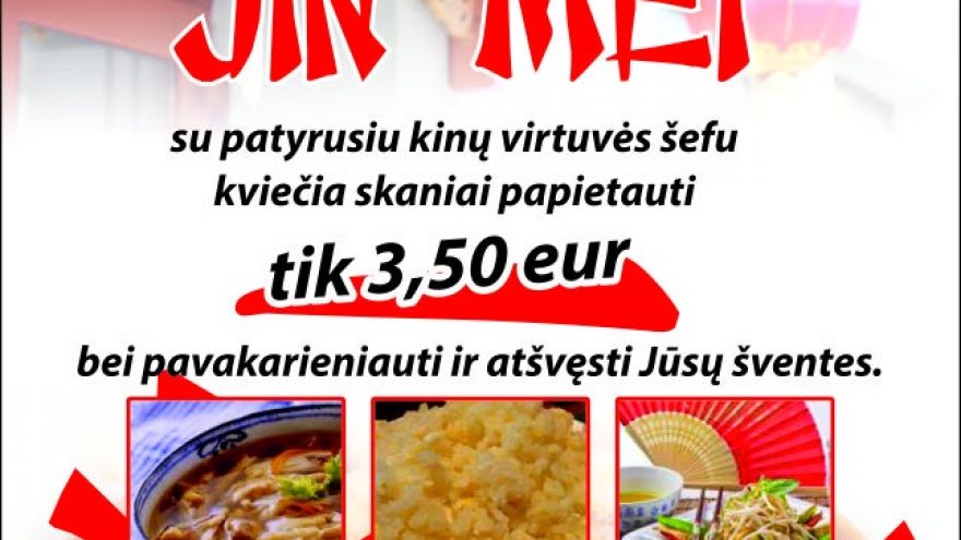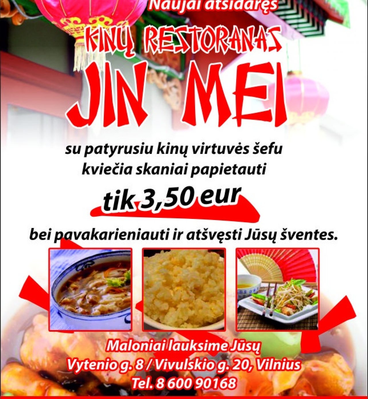 Naujai atsidaręs kinų restoranas su patyrusiu kinų virtuvės šefu kviečia paragauti rytų virtuvės patiekalų. Pietų komplekso kaina tik 3,50 €. Įprastam meniu taikomos 10% nuolaidos, priimami užsakymai ir telefonu. Maloniai lauksime jūsu! 🙂