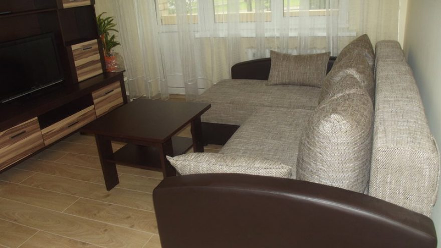 Klasikiniu stiliumi dekoruotame gyvenamajame kambaryje rasite atskirą miegamojo erdvę su plačia 160 cm. ilgio dvigule lova ir svetainės erdvę su minkštu išskleidžiamu kampu, plokščiaekranį televizorių su skaitmenine televizija.