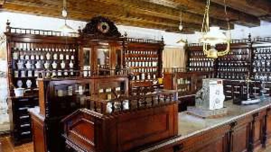 Farmacijos skyriaus ekspozicija. Ekspozicija vaizduoja XIX a. pab. Lietuvos miesto vaistinę.