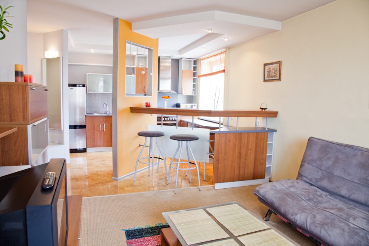 Svetainę nuo virtuvės skiria baras. Butas nuomojamas su baldais ir buitine technika (elektrine kaitlentė ir orkaite, gartraukiu, mikrobangų krosnele, skalbimo mašina, dulkių siurbliu ir televizoriumi). Vonia ir tualetas atskirai, vonioje šildomos grindys, 2 balkonai (1 įstiklintas), rūsys, įrengta apsaugos signalizacija, kabelinė TV.