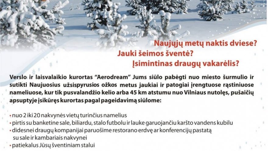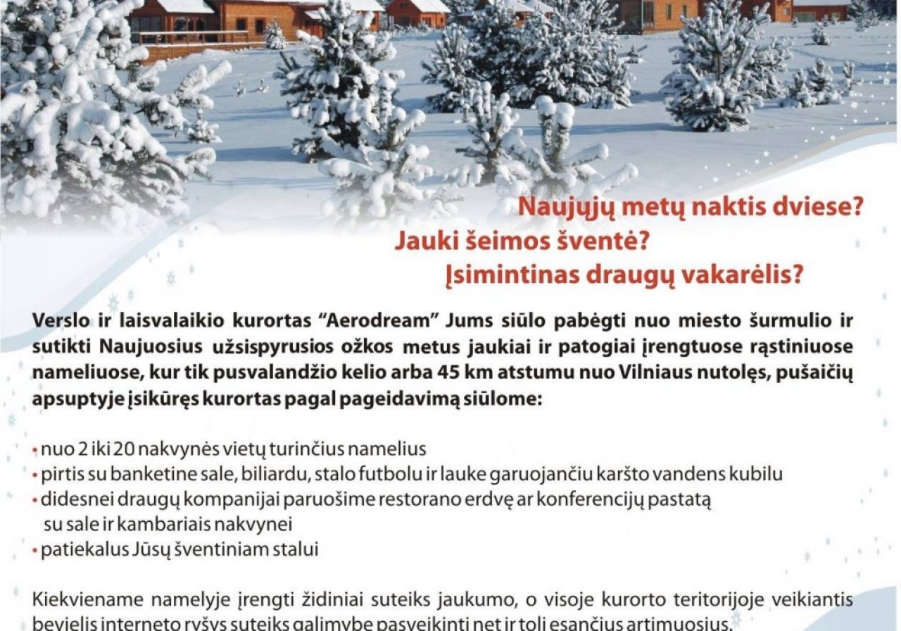 Verslo ir laisvalaikio kurortas “Aerodream” Jums siūlo pabėgti nuo miesto šurmulio ir sutikti Naujuosius Užsispyrusios Ožkos Metus jaukiai ir patogiai įrengtuose rąstiniuose komplekso nameliuose.
