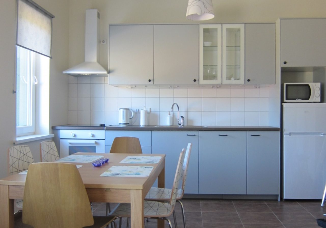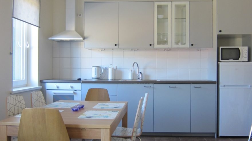 Bute yra du miegamieji, virtuvė sujungta su svetaine ir vonios/tualeto kambarys.Viename kambaryje yra dvigulė lova, komoda, didelė spinta, kitame – dvi viengulės lovos bei spintelė, svetainėje – didelė išskleidžiama kampinė sofa-lova, LED televizorius erdvus pietų stalas. Bute įrengta didelė virtuvė su visa reikalinga buitine technika (orkaitė, indaplovė, šaldytuvas, mikrobangų krosnelė). Erdviame vonios kambaryje įrentgtas wc,kriauklė su spinytle bei dušo kabina.Jūsų patogumui: švari patalynė bei rankšluoščiai, virtuvės indai bei stalo įranikai,lygintuvas, lyginimo lenta, elektrinis virdulys, fenas.