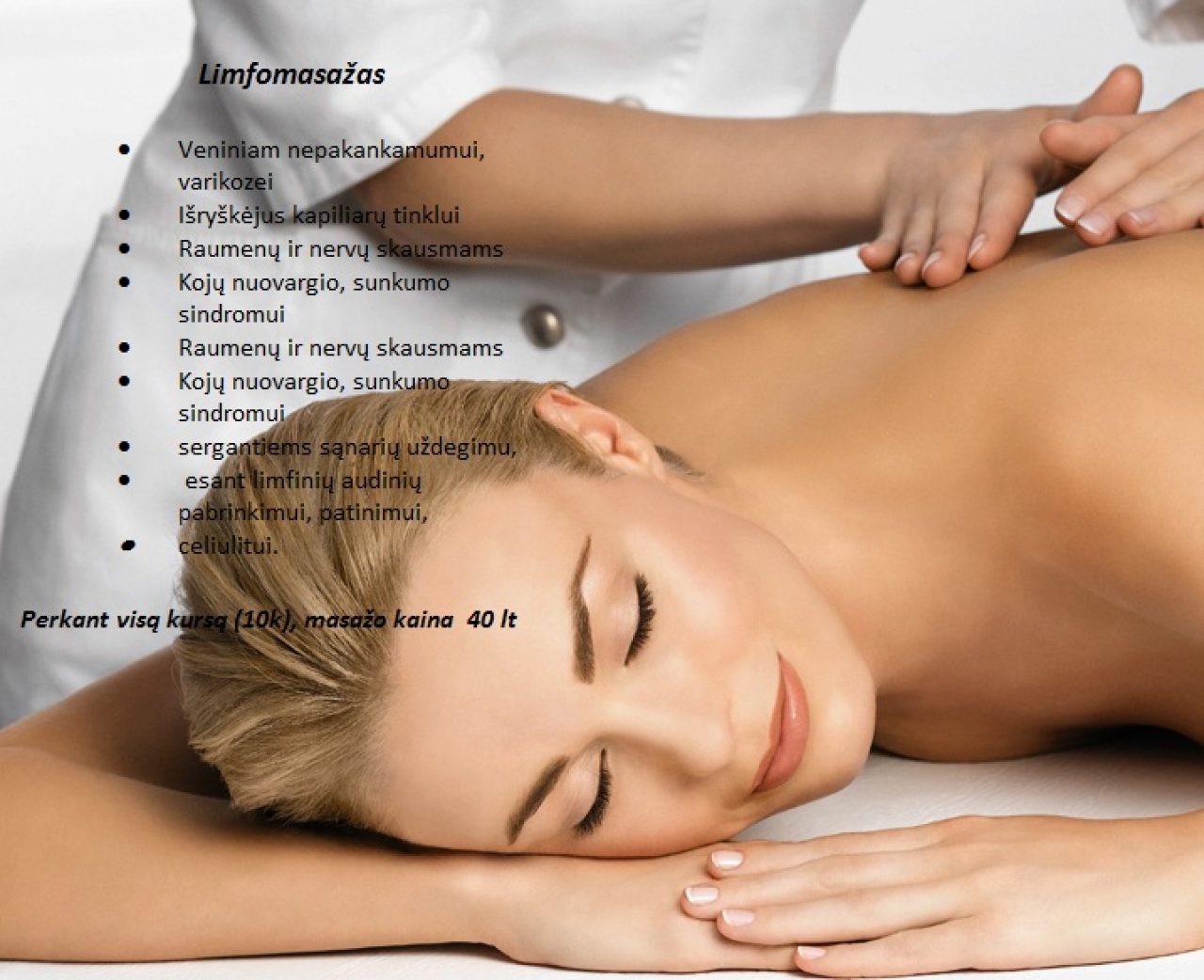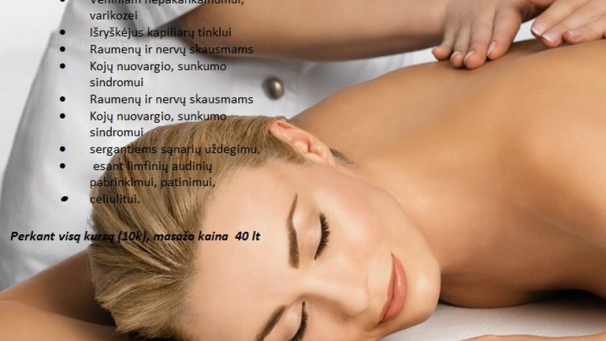 Atlieku šiuos masažus: Kosmetinį veido masažą- 30-45 min. 25 lt Limfodrenažas- 50 lt Klasikinį – segmentinį masažą- 90 min.40 lt Atpalaiduojantį masažą „Santana“-90 min. 40 lt Anticeliulitinį, molinių taurių masažą – 90 min. 50 lt Nugaros masažą- 30 min. 25 lt Medaus masažą- 90 min. 50 lt Anticeliulitinį Cello gėlio įviniojimą- 40 lt Anticeliulitiniai masažai atskiroms kūno dalims: Pilvas (su taure)- 10 lt Kojos (su taure)-25 lt Masažams naudoju natūralų, aukštos kokybės šalto spaudimo alieju. Dirbu namuose. (Erogeninių zonų,intymų masažą ir pan. NEDARAU) Taikomos nuolaidos!!!! Prašom, merginos, gražinames !!!!
