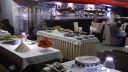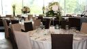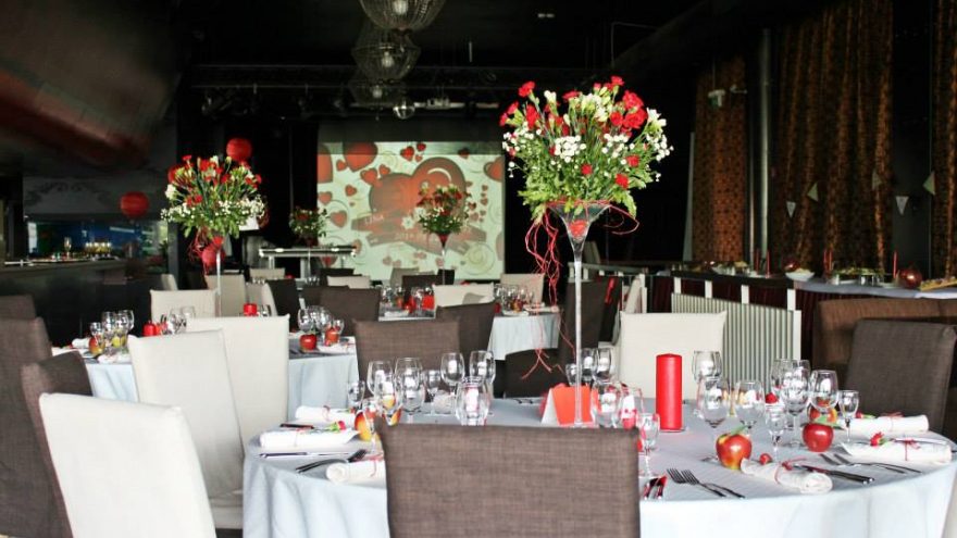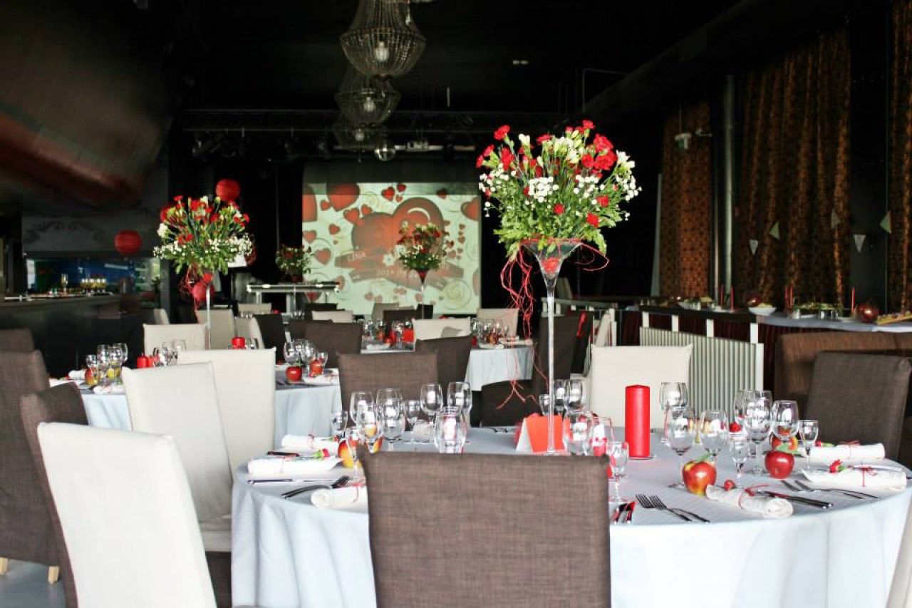 Prabangiomis staltiesėmis dengti staliukai, dekoruoti gėlių kompozicijomis ir kėdės, su pastelinės spalvos užvalkalais, sukuria jaukią ir šventišką nuotaiką. Masyvūs krištolo sietynai, tviskančios taurės ir blizgūs stalo įrankiai suteikia patalpai solidumo ir prabangos.