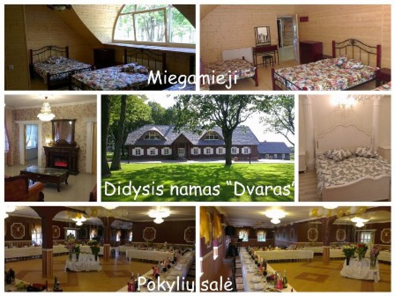 1.Didžioji pokylių salė – „Dvaras“. Pastato plotas virš 800 kv.m, pobūvių salė virš 200 kv.m., joje patogiai gali švęsti iki 100 žmonių. Antrame aukšte įrengti miegamieji kambariai 60 žmonių, pramogų zona su biliardo ir teniso stalais. Pastate yra labai didelė terasa, senovinis alaus rusys, virtuvė su visa įranga ir indais. Nuomos kaina 3000Lt. (Nuomojama nuo 2012-05-01d)