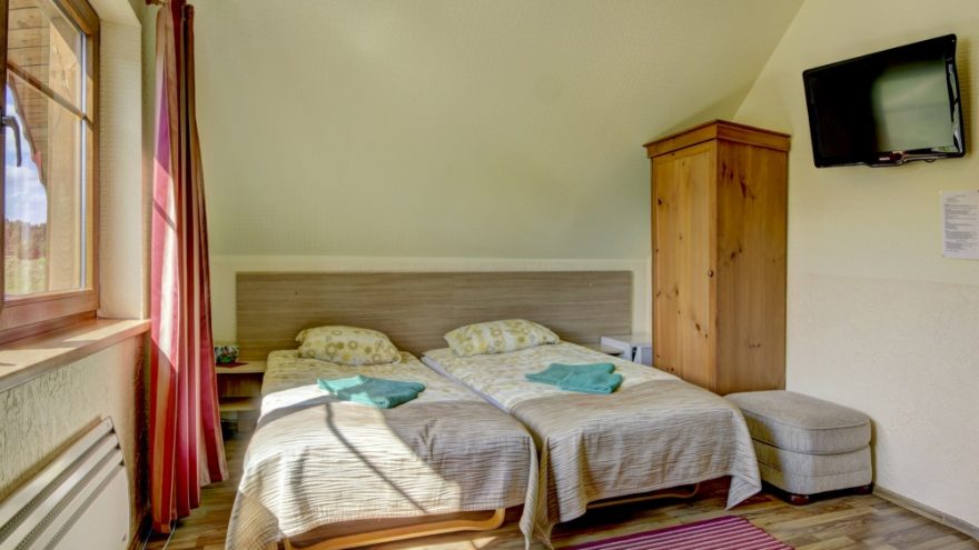 Nakvynei galėsite apsistoti viešbučio kambariuose arba rąstiniuose nameliuose. Patogiai apnakvindinti galime iki 90 svečių, o esant reikalui miegamų vietų skaičius gali būti padidintas.
