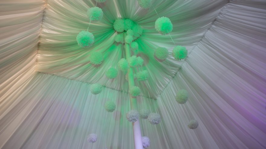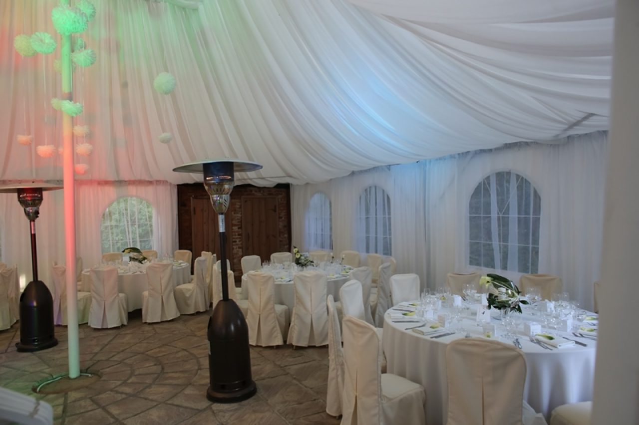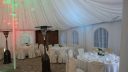 Salė jauki ir šilta. Sienos ir lubos nukabintos šilkiniu audiniu, tai suteikia iškilmingumo ir prabangos, todėl salė labai tinka vestuvių pokyliui ar bet kuriai kitai iškilmingai progai.