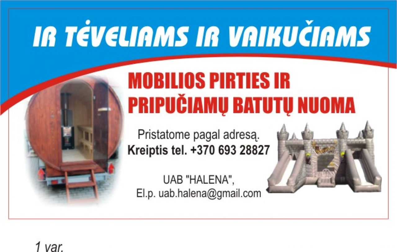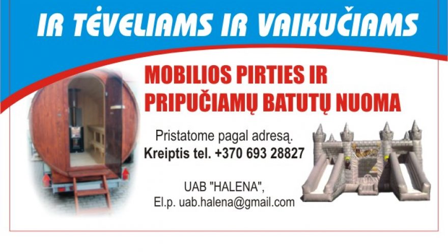 Išnuomojama pripučiami batutai ir mobili pirtis, galime pristatyti pagal adresą. Suteikite malonumą sau ir savo vaikučiams. Išsamesnė informacija tel. 869328827.