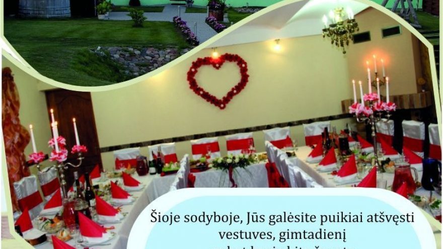 Šioje sodyboje, Jūs galėsite puikiai atšvęsti vestuves, gimtadienį ar bet kurią kitą šventę. Tam įrengta pokylių salė, galinti talpinti 90 žmonių. Taip pat galėsite pasikaitinti saunoje, sužaisti biliardo partiją. Čia pat galėsite ir pernakvoti – tam skirti 13 miegamųjų kambarių. Turime patyrtį įvairių švenčių organizavime:rengiame vestuves, krikštynas,jubiliejus ir kitas Jums svarbias šventes.Mes išklausome Jūsų norus bei pageidavimus ir stengiamės dėmesį kreipti į kiekvieną smulkmeną.Juk iš smulkmenų susidaro tobula visuma.Viskas Jūsų patogumui.
