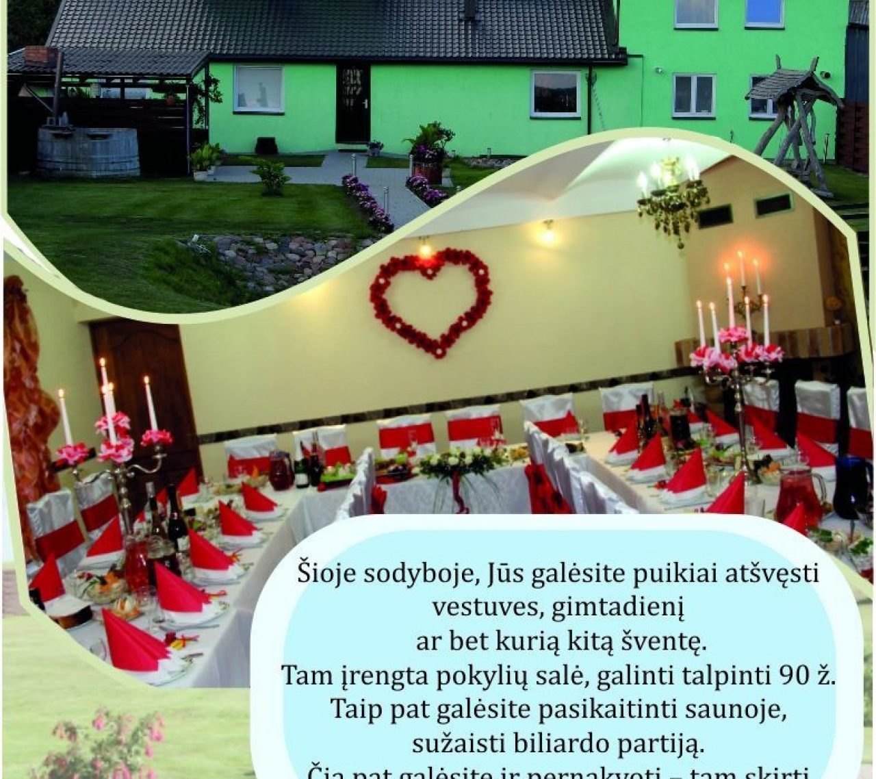 Šioje sodyboje, Jūs galėsite puikiai atšvęsti vestuves, gimtadienį ar bet kurią kitą šventę. Tam įrengta pokylių salė, galinti talpinti 90 žmonių. Taip pat galėsite pasikaitinti saunoje, sužaisti biliardo partiją. Čia pat galėsite ir pernakvoti – tam skirti 13 miegamųjų kambarių. Turime patyrtį įvairių švenčių organizavime:rengiame vestuves, krikštynas,jubiliejus ir kitas Jums svarbias šventes.Mes išklausome Jūsų norus bei pageidavimus ir stengiamės dėmesį kreipti į kiekvieną smulkmeną.Juk iš smulkmenų susidaro tobula visuma.Viskas Jūsų patogumui.