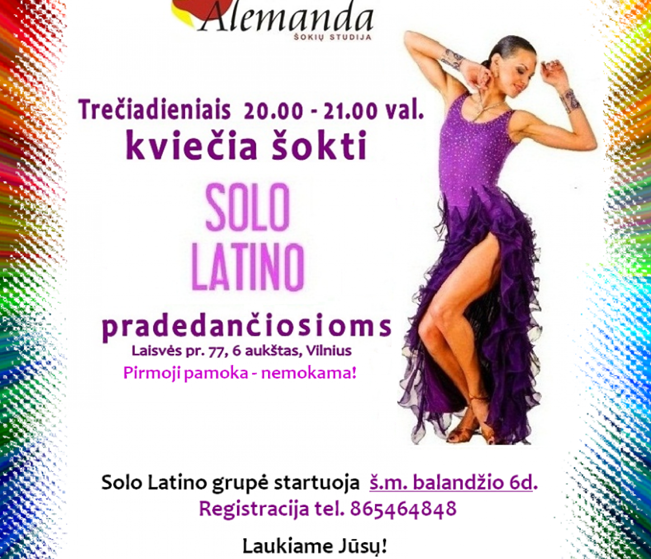 SOLO LATINO – Lotynų Amerikos šokių užsiėmimai merginoms ir moterims. Tai geriausias būdas laisvai šokti ir tobulėti net neturint poros, taip pat puiki alternatyva, nemėgstančioms treniruoklių ar sporto klubų. Šokant intensyviai dirba kojų, liemens, nugaros raumenys, rankos darosi grakštesnės, tobulėja laikysena, lavinama atmintis. Solo latino šokiai leis Jums ne tik patobulinti kūno linijas, bet ir atsipalaiduoti po dienos darbų, atskleisti savo žavesį ir moteriškumą. Šiuos šokius gali šokti kiekviena, nepaisant amžiaus ar kūno sudėjimo.