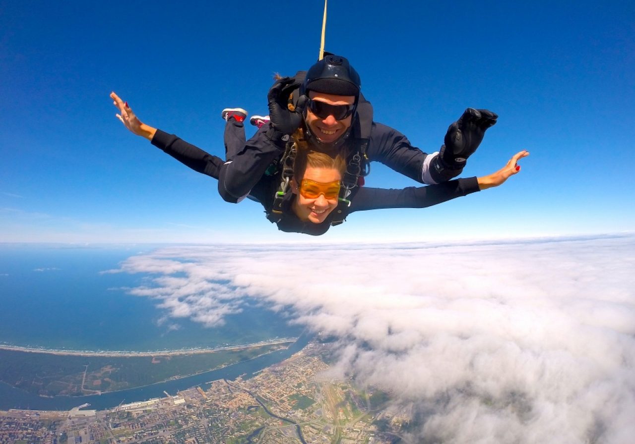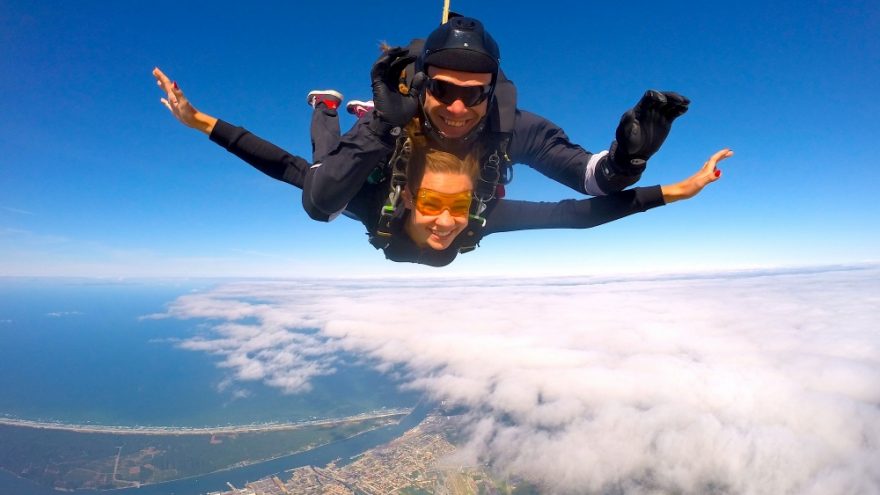 Kartu su instruktoriumi šoksite iš 3 000 m aukščio ir pasieksite 200 km/h greitį.