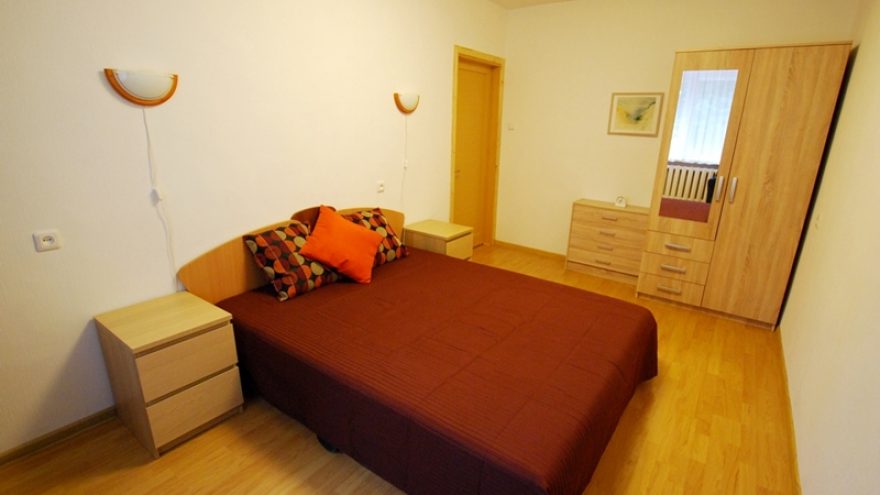 Svetainėje yra ištiesiama dvigulė sofa – lova, valgomasis stalas bei plokščiaekranis televizorius. Nedidelėje virtuvėlėje rasite dujinę viryklę (be orkaitės), mikrobangų krosnelę, šaldytuvą, skalbimo mašiną bei visus įrankius maisto gaminimui. Virtuvė yra bendroje erdvėje su svetaine. Miegamajame puikiai pailsėsite dvigulėje lovoje. Šiuos du kambarius skiria bendras koridorius. WC yra kartu su dušo kabina.