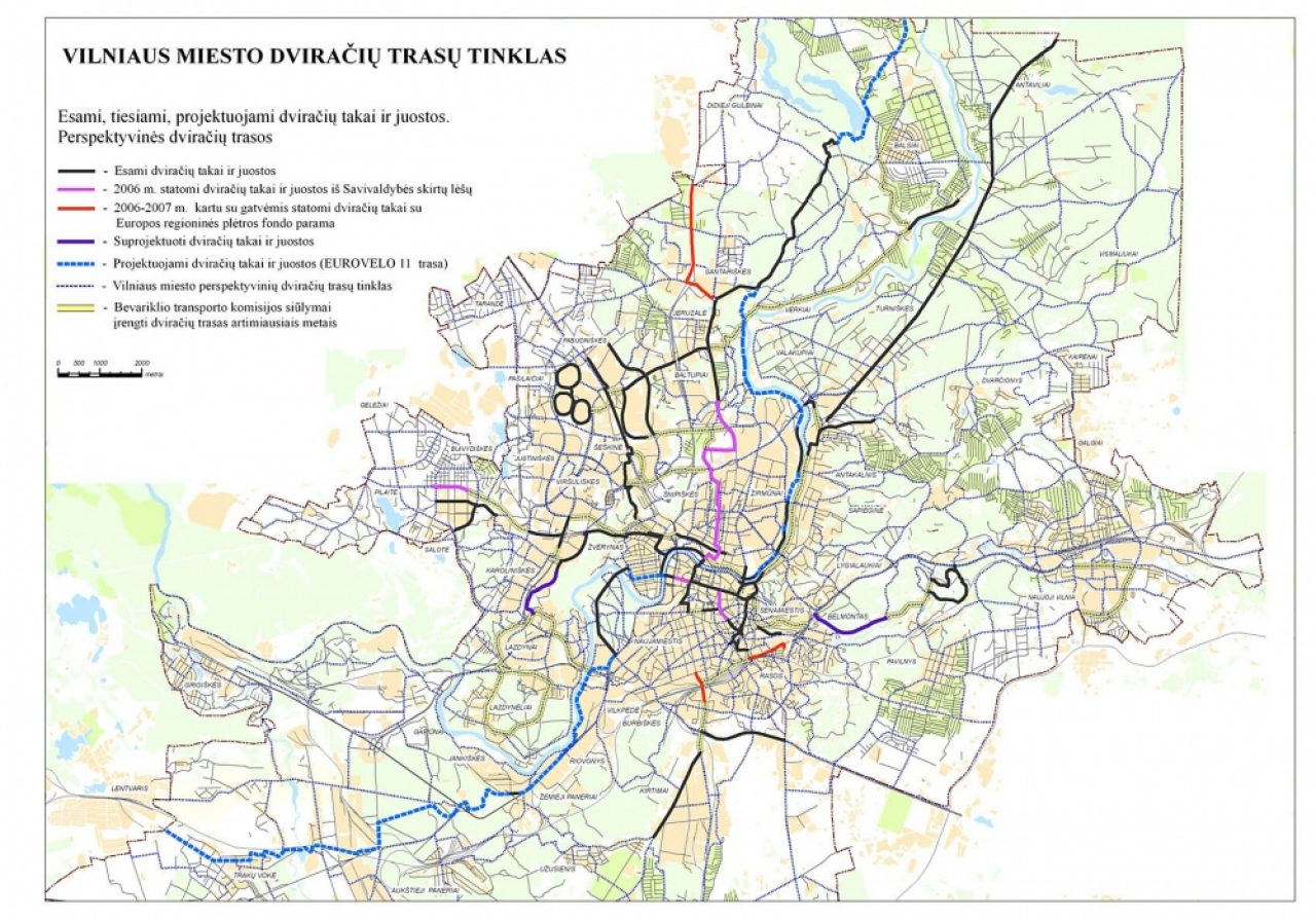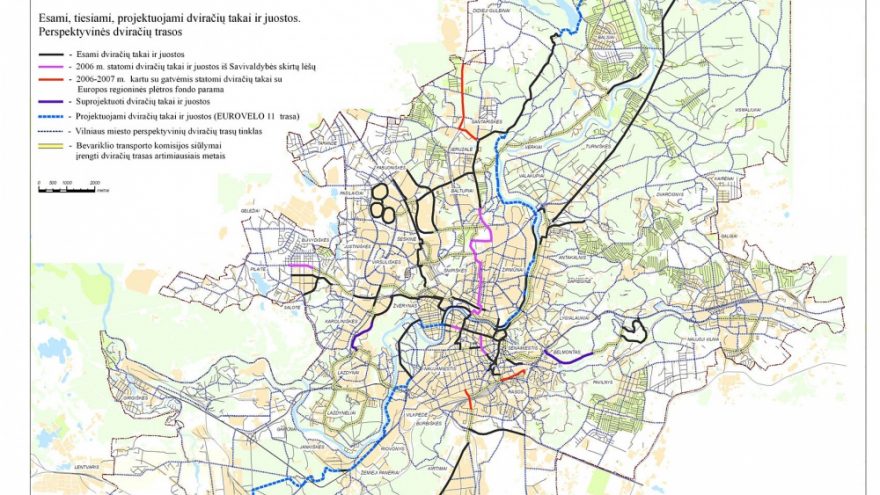 Šiame žemėlapyje pavaizduoti esami ir tiesiami dviračių takai bei trasos, kurios artimiausiu metu bus nutiestos ar yra projektuojamos.